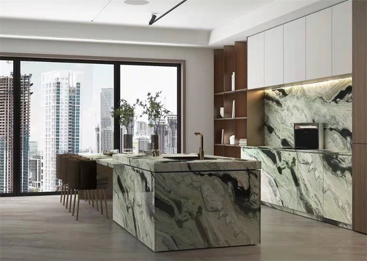 Мрамор Raggio Verde — это узнаваемый камень, который придает изделиям индивидуальность. Он широко используется в классических и традиционных проектах. Инкрустация с тонкими и более глубокими прожилками серо-черного цвета, ее также называют нефритово-зеленым мрамором или зеленым мрамором Шангри-ла.
